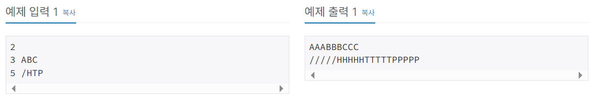 문자열 S를 입력받은 후에, 각 문자를 R번 반복해 새 문자열 P를 만든 후 출력하는 프로그램을 작성하시오. 즉, 첫 번째 문자를 R번 반복하고, 두 번째 문자를 R번 반복하는 식으로 P를 만들면 된다. S에는 QR Code "alphanumeric" 문자만 들어있다.