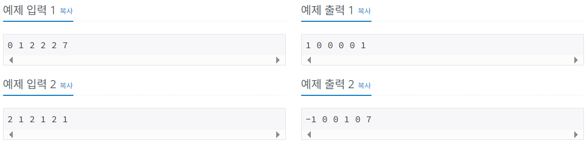 첫째 줄에 입력에서 주어진 순서대로 몇 개의 피스를 더하거나 빼야 되는지를 출력한다. 만약 수가 양수라면 동혁이는 그 개수 만큼 피스를 더해야 하는 것이고, 음수라면 제거해야 하는 것이다.