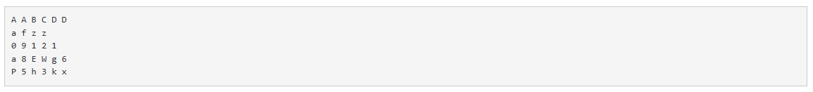 이 장난감에 있는 글자들은 영어 대문자 ‘A’부터 ‘Z’, 영어 소문자 ‘a’부터 ‘z’, 숫자 ‘0’부터 ‘9’이다. 영석이는 칠판에 글자들을 수평으로 일렬로 붙여서 단어를 만든다. 다시 그 아래쪽에 글자들을 붙여서 또 다른 단어를 만든다. 이런 식으로 다섯 개의 단어를 만든다. 아래 그림 1은 영석이가 칠판에 붙여 만든 단어들의 예이다.