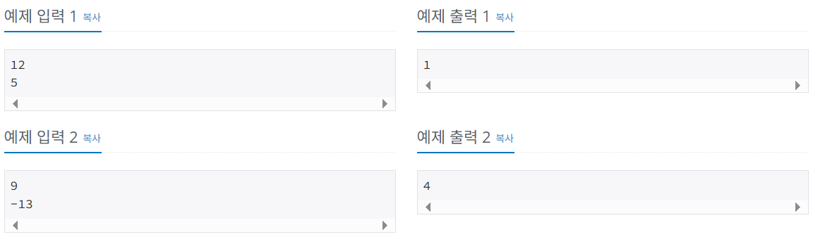 첫 줄에는 정수 x가 주어진다. (−1000 ≤ x ≤ 1000; x ≠ 0) 다음 줄에는 정수 y가 주어진다. (−1000 ≤ y ≤ 1000; y ≠ 0)