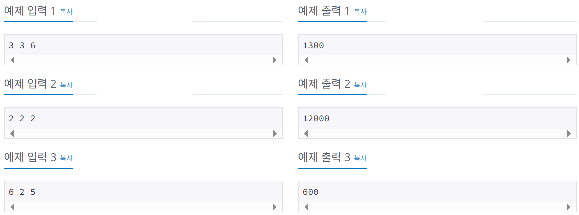첫째 줄에 3개의 눈이 빈칸을 사이에 두고 각각 주어진다.