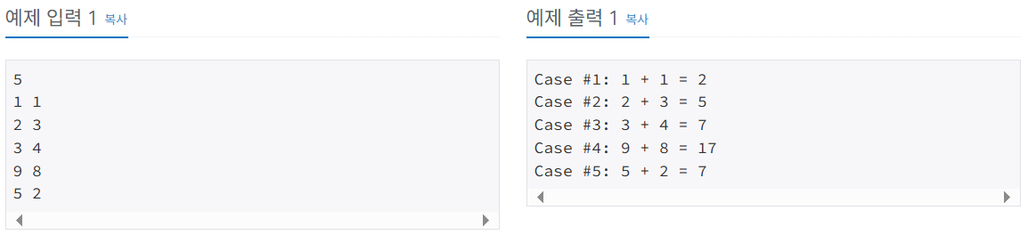 각 테스트 케이스마다 "Case #x: A + B = C" 형식으로 출력한다. x는 테스트 케이스 번호이고 1부터 시작하며, C는 A+B이다.