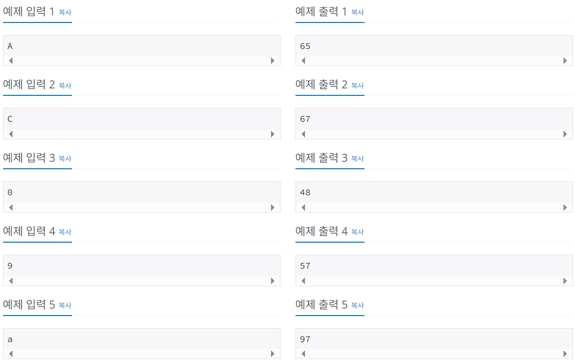 입력으로 주어진 글자의 아스키 코드 값을 출력한다.